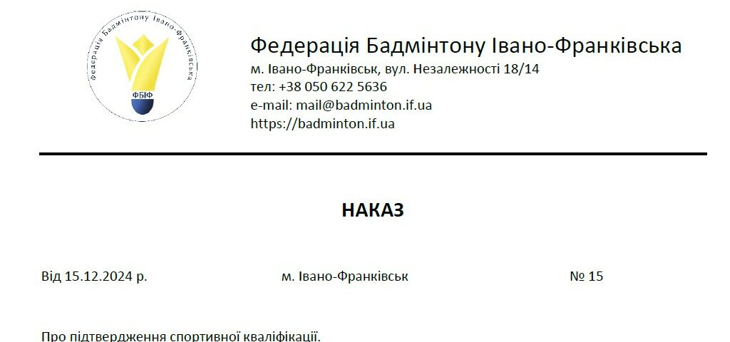 Наказ ФБІФ № 15 від 15.12.2024 року