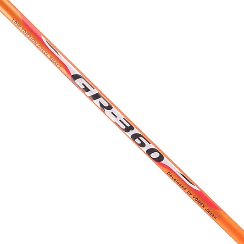 Ракетки Yonex GR360 мають міцний обід зі сталі, який з’єднується зі стержнем через спеціальний трійник, що забезпечує додаткову міцність конструкції. Вони поставляються з заводською натяжкою, а струна проходить у отвори ободу через пластикові громмети, які запобігають її перетиранню. Вага ракетки становить 96 грамів.