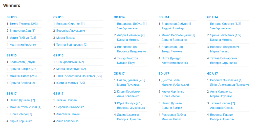 Учасники боролися у кожному з 5 розрядів: MS, WS, (U13, U15, U17) MD, WD, XD (U14, U17).